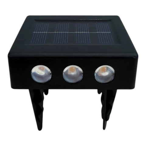 Cuenta con 12 LEDs distribuidos en los laterales (3 por lado), que generan una luz rasante decorativa en múltiples direcciones, ideal para resaltar caminos y bordes.