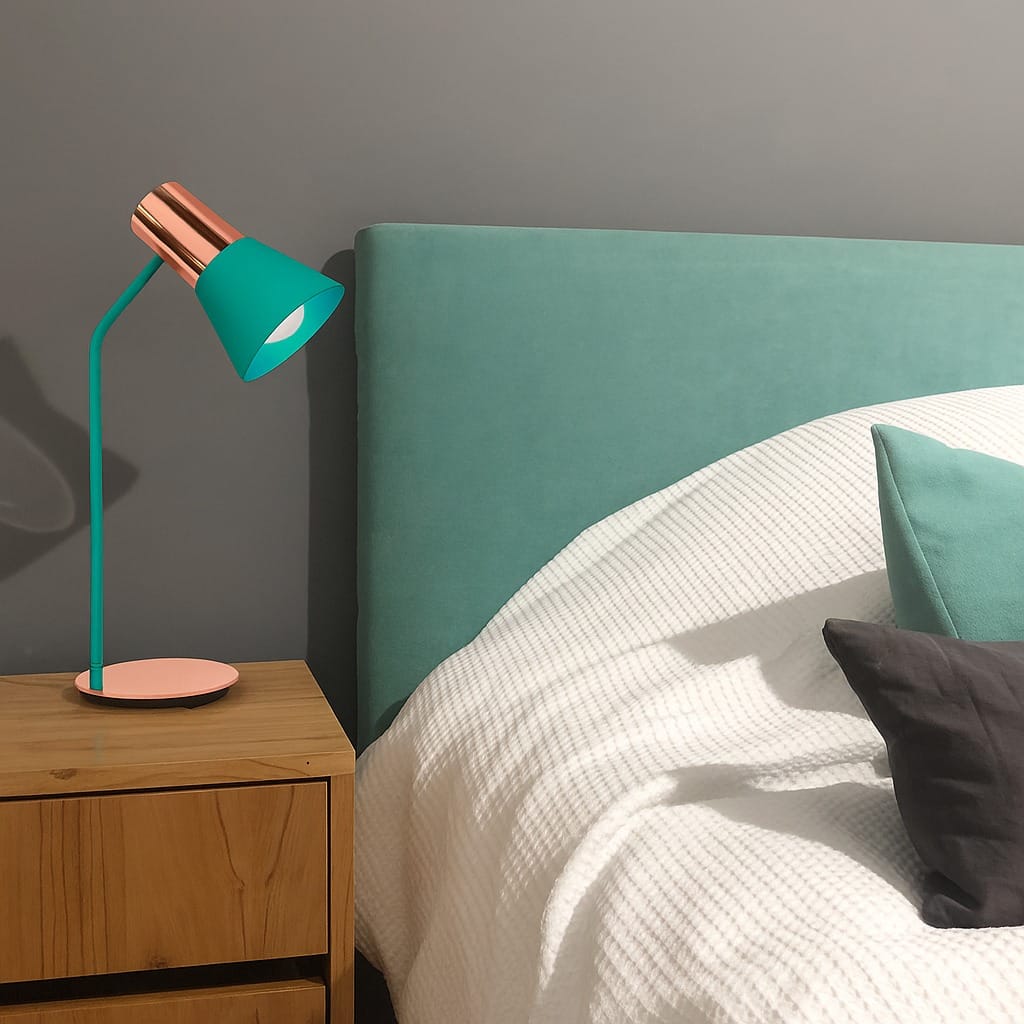 Las lámparas de mesa Línea Ostende destacan por su diseño elegante y atemporal. Su pantalla metálica tipo embudo (Ø12 cm) y los delicados detalles en cobre aportan un estilo minimalista y refinado, ideal para realzar distintos ambientes.