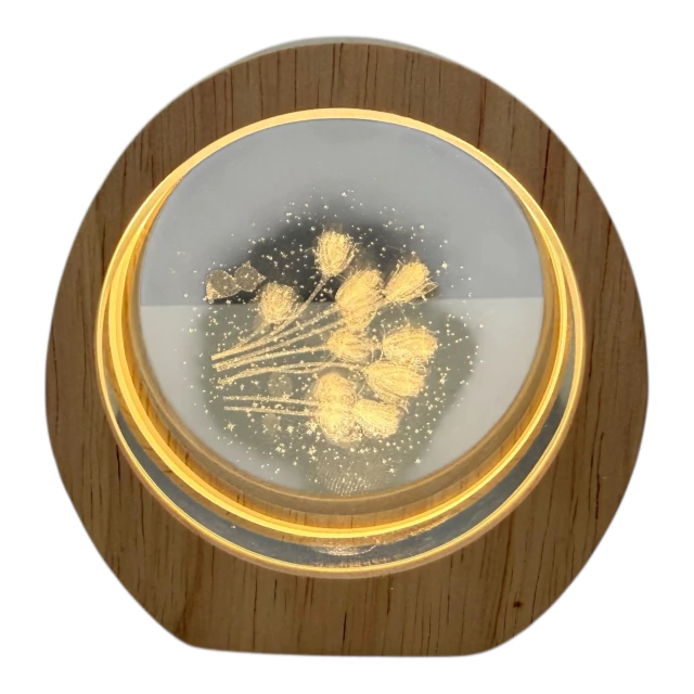Lámpara LED con efecto 3D que ilumina un disco acrílico grabado, montado sobre una base compacta de madera. Emite una luz cálida fija que resalta el diseño elegido.